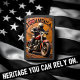 This lighter features a painted, high-relief image of a biker in a black leather jacket and full-face helmet, aggressively riding a red cruiser-style motorcycle. A small, winged bronze emblem is visible near the handle bars. The background is a stark, textured orange and brown sunburst, featuring the text "I AMERICA" with a large red heart replacing the word "LOVE". The rider is shown in motion on what appears to be a wooden road. The entire design is set on a matte black lighter casing. The design may look real due to the high detail in the artwork.