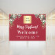 Red background, white text. Personalize and add your logo. Text: Happy Holidays! and Welcome. Decorated with pine sprigs and cones.