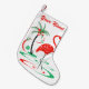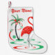 A fun, festive, flamingo design with a retro touch in red and green. A red flamingo wades in the water next to a palm tree decorated with Christmas baubles and ribbon. A customizable design for you to personalise with your own text, images and ideas. An original digital art image created by Jess Perry.