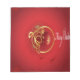 This artwork features a central design of stylized jingle bells accompanied by a swirling flourish, set against a solid red background. The text "Merry Christmas" is elegantly written in cursive script on the right side, creating a simple yet striking composition that emphasizes the holiday elements.