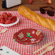 Festive Red Christmas paper bowls that feature snowflakes, candy canes, gingerbread houses, bows, and Christmas stockings.