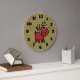 A clock with a red Christmas reindeer illustration. Festive and cute. Set on a background which is a digital image of kraft paper, not actual kraft paper.