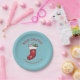 Red Christmas Stocking On Blue With Custom Text Paper Plates