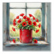 A gorgeous ai watercolor illustration of red poppies in a red tin painted coffee can sitting on a window sill on a summer day.