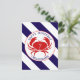 A birthday postcard invitation featuring an illustration of a red crab with blue striped background. Personalize all text.