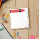 A note from School Teacher notepad personalized with the teacher's name written across a red crayon with colorful stars. Kindergarten teacher notepad with a crayon and stars.