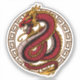A powerful Chinese dragon, rendered in vibrant shades of red and gold, coils within a circular frame adorned with intricate geometric patterns. The dragon's head is raised, its eyes glowing with an intense, almost menacing expression. Its scales are depicted in meticulous detail, showcasing their texture and pattern. The dragon's powerful body is coiled in a dynamic pose, suggesting both strength and agility.