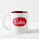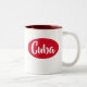 A red and white mug that says "Cuba" on it. A nice simple design that stand out from far.