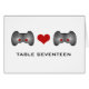 Quirky and totally geeky chic is this Cute Gamer Wedding Table Number Card featuring a pair of video game controllers with red buttons. A heart in the middle connects the two controllers. This nerdy table card is perfect for the gaming couple. Easy to customize, simply add the appropriate table number(s) in the text field provided. Click "Customize It" to find more personalization options.