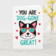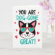 This greeting card features a black dog with a white stripe down its face, looking straight ahead with a sweet, friendly expression. The pup wears oversized heart-shaped glasses with bright red frames and light turquoise lenses, which makes the center feel fun and romantic ❤️. Above the dog, the text reads “YOU ARE DOG-GONE GREAT!” in hand-drawn, uppercase letters. The words are split between black and turquoise, and the turquoise matches the glasses lenses for a nice tie-in. Below the dog, the same message appears again, keeping the compliment front and center. Small red hearts are scattered around the dog on a plain white background, like little reminders of affection 💌🍫.