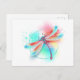 Red, flying, artistically drawn, in bright colors with textured iridescent, blue wings on white background, painted over with splashes of watercolor paint. Bright red dragonfly.
