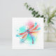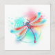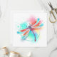 Red, flying, artistically drawn, in bright colors with textured iridescent, blue wings on white background, painted over with splashes of watercolor paint. Bright red dragonfly.