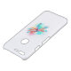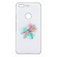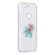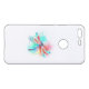 Red, flying, artistically drawn, in bright colors with textured iridescent, blue wings on white background, painted over with splashes of watercolor paint. Bright red dragonfly.