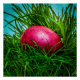 Red Easter egg in the nest of green grass against the background of blue sky and white cloud. A spot of Heavenly light on the egg and on the blades of the grass. Happy Easter! Stylized and textured photography. Photo painting.