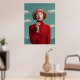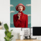 A striking portrait of a red-haired woman in a bold red outfit, holding a red apple against a dreamy turquoise sky. Her vintage hat and vivid red lips enhance the surreal, high-fashion aesthetic. Perfect for advertising, editorial, or branding visuals.