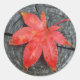 A photograph of a red vibrant maple leaf sits in the center of dark gray tree rings. This round envelope seal is perfect for autumn thank you notes, birthday cards and invitations.