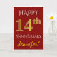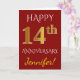 This simple, personalized wedding anniversary greeting card design features the message "HAPPY 14th ANNIVERSARY", with the "14th" having a faux gold-like appearance. The front also features a custom name, and a red colored background. The inside features a customizable wedding anniversary greeting message. It could be given to a husband or a wife in celebration of the couple’s fourteenth wedding anniversary. [~Z0000078]