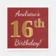 This simple paper napkin design features a message like "Andrew’s 16th Birthday!", with the "16th" having a faux gold-like appearance, on a red colored background. The name can be personalized. It could be used at a birthday party for somebody who is celebrating their sixteenth birthday. [~Z0000080]
