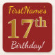 This simple paper coaster design features a message like "FirstName’s 17th Birthday!", with the "17th" having a faux/imitation gold-like color appearance, on a red colored background. The name can be customized. Personalized paper coasters like these could perhaps be used at a birthday party for somebody who is celebrating their seventeenth birthday. [~Z0000195]