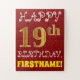 This fun and simple birthday puzzle design features the message "HAPPY 19th BIRTHDAY", with the "19th" having a faux/imitation gold-like color appearance. It also features a custom name, and a red colored background. It could be a fun and special way to deliver a personalized birthday greeting to somebody who is celebrating their nineteenth birthday. [~Z0000200]