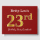 This guest book design features the ordinal number "23rd" with a faux/imitation gold-like appearance. It also features a customized name, and a red colored background. It could be used at a party for somebody celebrating their twenty third birthday. [~Z0000055]
