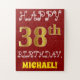 This fun and simple birthday puzzle design features the message "HAPPY 38th BIRTHDAY", with the "38th" having a faux/imitation gold-like color appearance. It also features a custom name, and a red colored background. It could be a fun and special way to deliver a personalized birthday greeting to somebody who is celebrating their thirty eighth birthday. [~Z0000200]