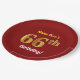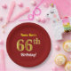 This simple, personalized, birthday-themed paper plate design features a customizable message like "Name-Here’s 66th Birthday!", where the name can be changed, and with the "66th" having a faux/imitation gold-like appearance. It also features a red colored background. Paper plates like these could perhaps be used at a party being held to celebrate somebody’s sixty sixth birthday. [~Z0000144]