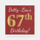 This simple paper napkin design features a message like "Betty-Lou’s 67th Birthday!", with the "67th" having a faux gold-like appearance, on a red colored background. The name can be personalized. It could be used at a birthday party for somebody who is celebrating their sixty seventh birthday. [~Z0000080]