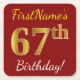 This simple paper coaster design features a message like "FirstName’s 67th Birthday!", with the "67th" having a faux/imitation gold-like color appearance, on a red colored background. The name can be personalized. Personalized paper coasters like these could perhaps be used at a birthday party for somebody who is celebrating their sixty seventh birthday. [~Z0000195]