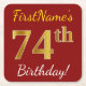 This simple paper coaster design features a message like "FirstName’s 74th Birthday!", with the "74th" having a faux/imitation gold-like color appearance, on a red colored background. The name can be customized. Personalized paper coasters like these could perhaps be used at a birthday party for somebody who is celebrating their seventy fourth birthday. [~Z0000195]