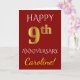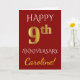 This simple, personalized wedding anniversary greeting card design features the message "HAPPY 9th ANNIVERSARY", with the "9th" having a faux gold-like appearance. The front also features a customized name, and a red colored background. The inside features a personalized wedding anniversary greeting message. It could be given to a husband or a wife in celebration of the couple’s ninth wedding anniversary. [~Z0000078]