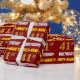 This wrapping paper design features a message like "FIRST-NAME’S 41st BIRTHDAY!", with the "41st" having a faux/imitation gold-like color appearance, and with the name and "BIRTHDAY" in a fun, bold font. The name is customizable, and the background is colored red. Wrapping paper like this could perhaps be used when wrapping birthday gifts being given to somebody in celebration of their forty first birthday. [~Z0000204]