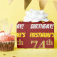 This wrapping paper design features a message like "FIRSTNAME’S 74th BIRTHDAY!", with the "74th" having a faux/imitation gold-like color appearance, and with the name and "BIRTHDAY" in a fun, bold font. The name can be customized, and the background is colored red. Wrapping paper like this could perhaps be used when wrapping birthday gifts being given to somebody in celebration of their seventy fourth birthday. [~Z0000204]