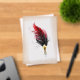 Artistically drawn, antique fountain pen embellished with dark red feather on white background.