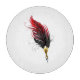 Artistically drawn, antique fountain pen embellished with dark red feather on white background.