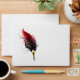 Artistically drawn, antique fountain pen embellished with dark red feather on white background.