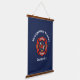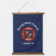 Stylish wall tapestry for firehouses, firefighters and their families, features red generic fire department logo on dark blue background. Customize with city or county department details or firefighter name in modern white font