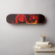 a decorative dragon artwork in red and orange colors appearing like flames in tribal tattoo style on a skateboard.