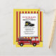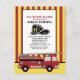 Red and yellow striped firetruck / firefighter child's 6th birthday party invitation postcard. Text says, "Sound the alarm, CHILDSNAME is turning 6."