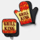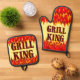 A Grill King oven mitt and pot holder in a western flaming font for cooks and cookout chefs with graphic art of red and orange flames at top and bottom of the design.
