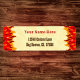 Custom return address labels with retro red curly and western brown letters with graphic art of red and orange flames on each side on a faux grunge background.
