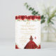 This elegant and glamorous birthday party invitation features a beautiful princess with brown red hair and fair skin in a red ball gown. The text combines handwritten script and modern sans serif fonts for a classy and sophisticated look. The floral arrangements, butterflies and gold confetti create the perfect blend of rustic and chic.