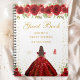 This elegant and glamorous sweet sixteen guest book features a beautiful princess with brunette hair and fair skin in a red ball gown. The text combines handwritten script and modern sans serif fonts for a classy and sophisticated look. The floral arrangements, butterflies and gold confetti create the perfect blend of rustic and chic.