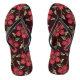 Red flowers and greenery on dark brown, these floral print pattern flip flops are perfect to dress up your outfit for any occasion.