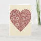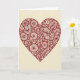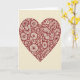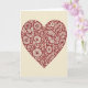 This greeting card shows a large, even heart in deep red, set against a light cream background. Inside the heart, the red and cream shapes form a tight pattern of flowers and leaves that fills the whole space. You can spot small daisy-like blooms, trumpet-shaped flowers, and many different leaf shapes woven together. Near the upper left curve of the heart, there’s a small butterfly tucked into the pattern, like it just landed for a moment. The two-color look keeps it simple but still eye-catching, with the red standing out clearly against the pale background. There isn’t any text printed on the front, so the heart design is the main focus and your note inside can do the talking. It feels romantic and calm, making it a sweet choice for a partner or a close friend 💕❤️.