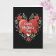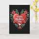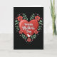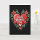 This card features a glossy red heart centered on a deep black background, catching the light with small highlights that make it look rounded and touchable. Across the heart, white lettering sits neatly in the middle, reading as a loving message that feels close and caring ❤️. Around it, a curved wreath of flowers and leaves forms a larger heart outline, like a gentle embrace around the main shape. The blossoms are deep red with slightly lighter edges and dark detailed centers, spaced evenly with slim green leaves that angle outward to suggest soft movement. Small star shapes and tiny round sparkles are scattered in pale pink and creamy white, adding a sweet, friendly twinkle 🌼. At the bottom of the large heart, a small white bird stands calmly as if keeping watch over the message. The bird has a bright yellow beak and matching yellow feet, set just below the heart’s lower curve.