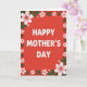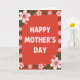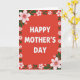 This greeting card features a tall, red background that sets a warm, affectionate tone ❤️. Centered in the middle, large white sans‑serif letters read “HAPPY MOTHER’S DAY,” standing out clearly against the rich color. The words are stacked neatly with even spacing, giving the message a confident, easy-to-read look. Around the edges, a border of stylized flowers and leaves frames the text like a gentle embrace, adding a caring, close-to-the-heart feel. Soft pale pink blossoms mingle with deep green leaves, and the petals fade from light blush to deeper rosy centers, suggesting a tender, loving glow. Larger blooms sit near the corners to steady the layout, while smaller flowers trail along the sides as if they’re quietly keeping company 🌼. The floral shapes remain smooth and decorative, with the pink petals and green foliage forming a continuous frame around the white lettering.