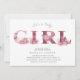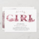Watercolor floral script "girl" with nice foliage and birds coupled with all information in serif font. beautiful red palette color scheme for gender reveal baby shower and modern layout.