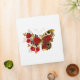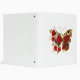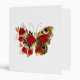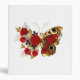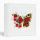 Red peacock eyed flower butterfly with red textured wing, decorated with composition of red, artistically painted roses with golden stems and leaves on white background.