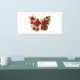 Red peacock eyed flower butterfly with red textured wing, decorated with composition of red, artistically painted roses with golden stems and leaves on white background.